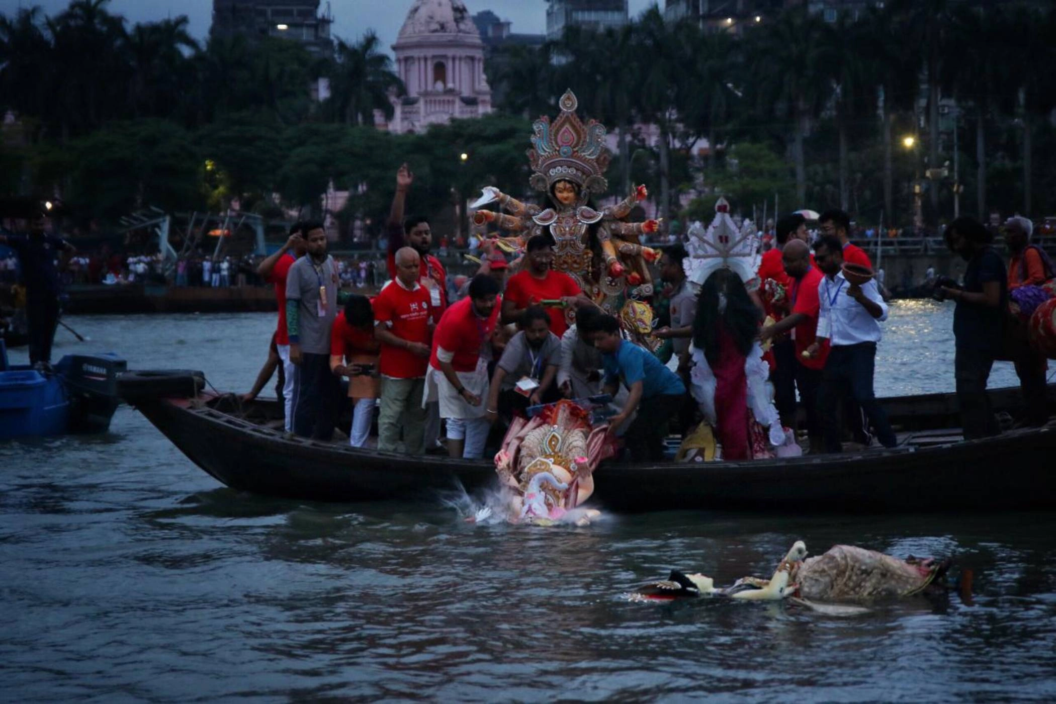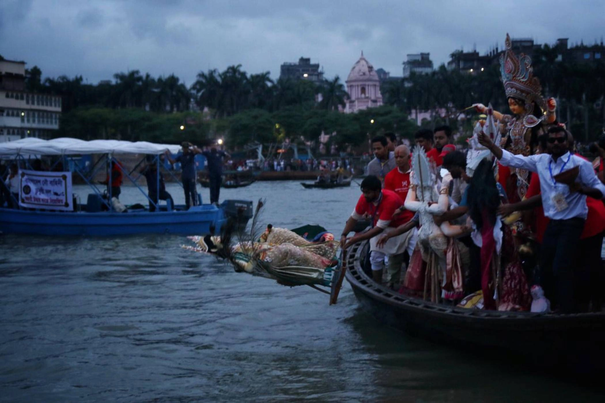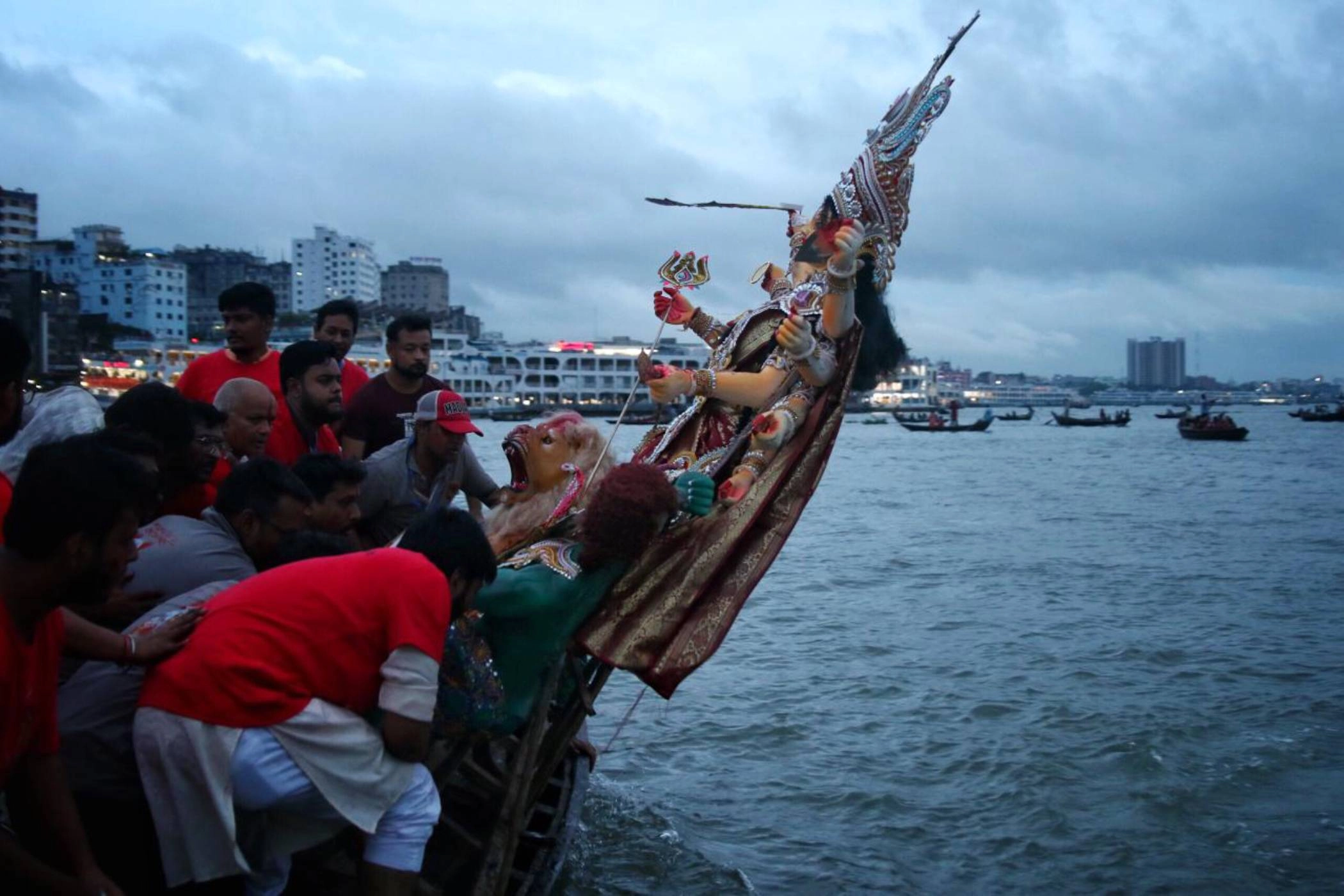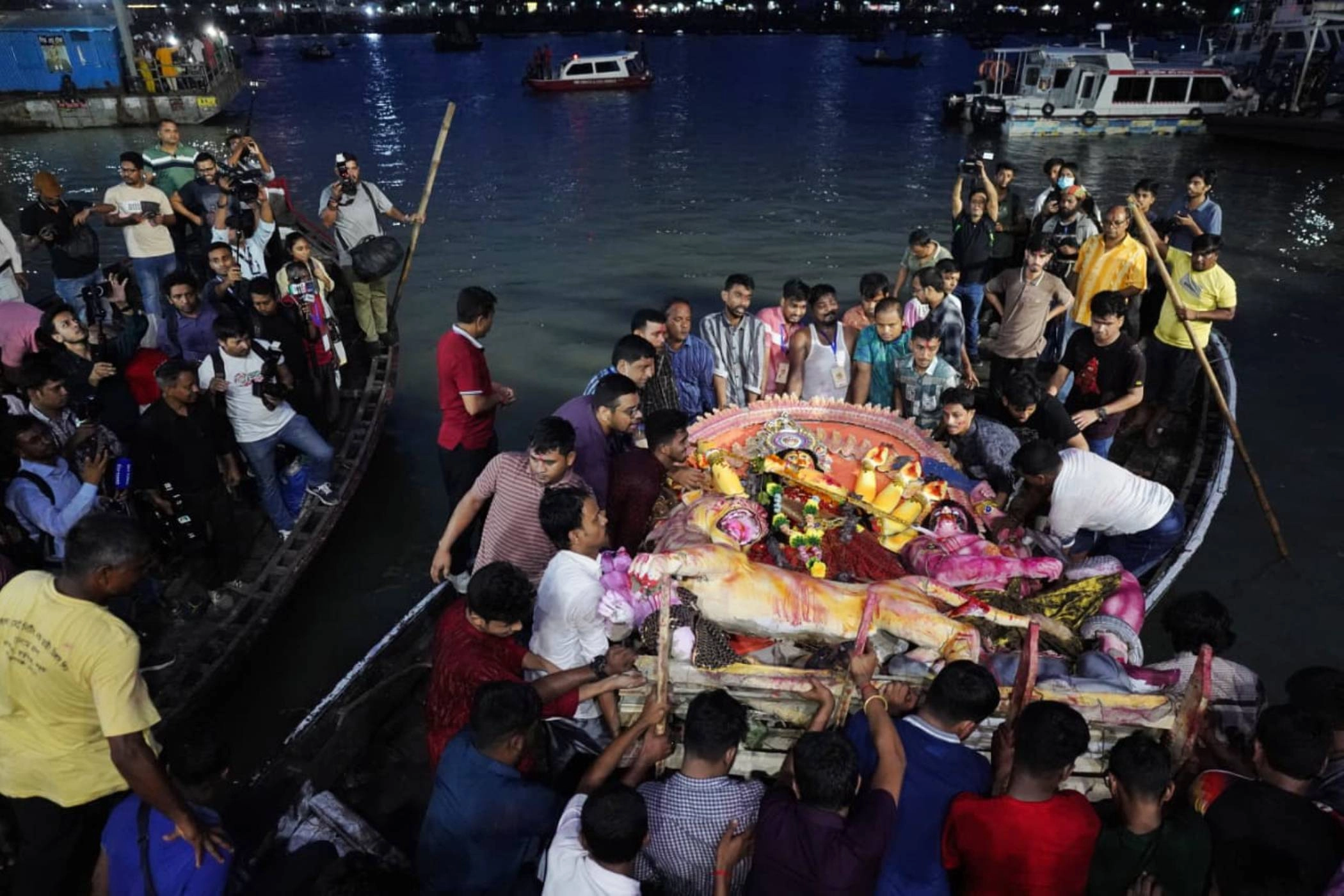 Devotees immerse the idols of Goddess Durga and her children in the Buriganga River at Sadarghat, Dhaka, marking the end of Sharadiya Durga Puja — the biggest festival of the Bengali Hindu community— on Thursday, October 2, 2025.