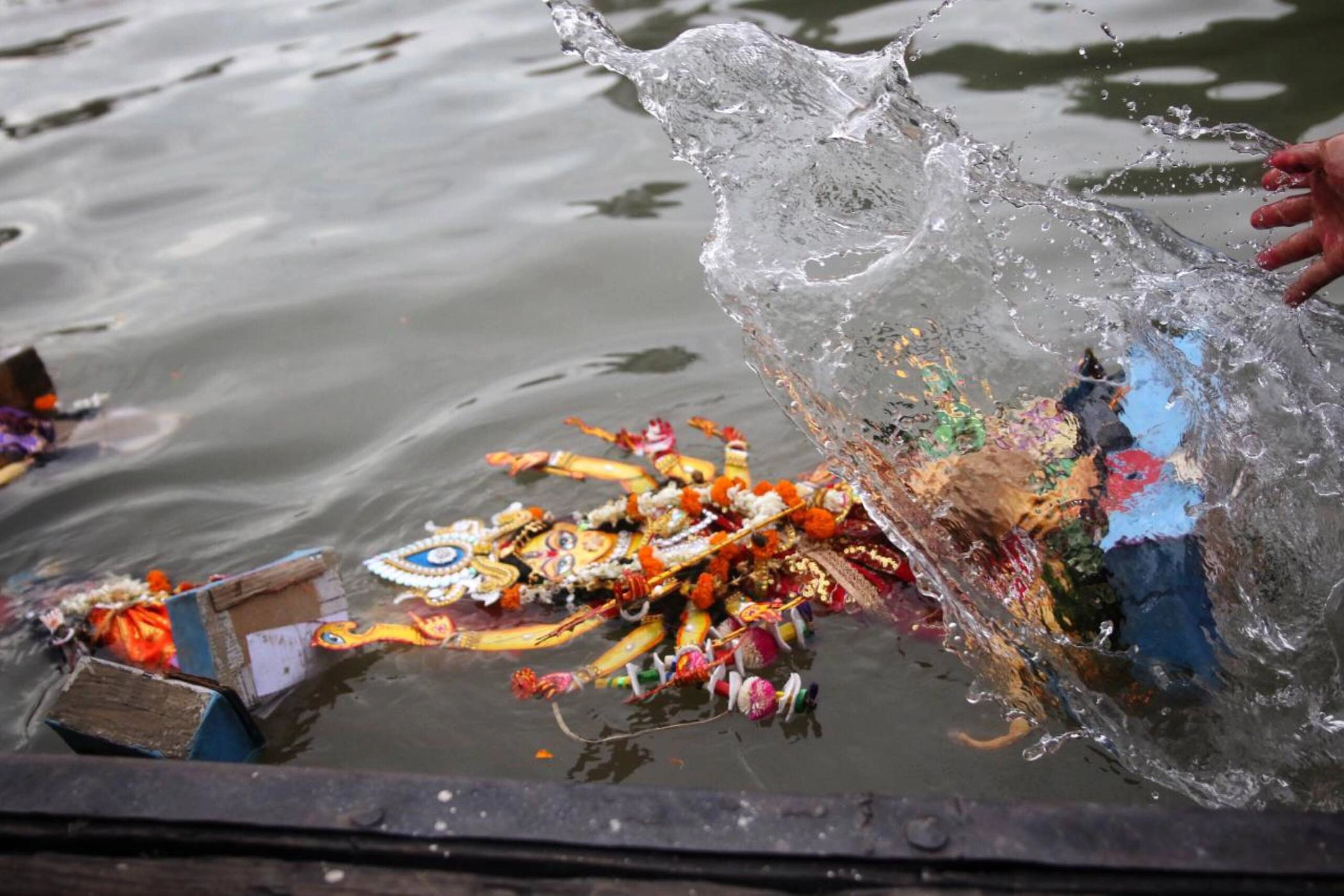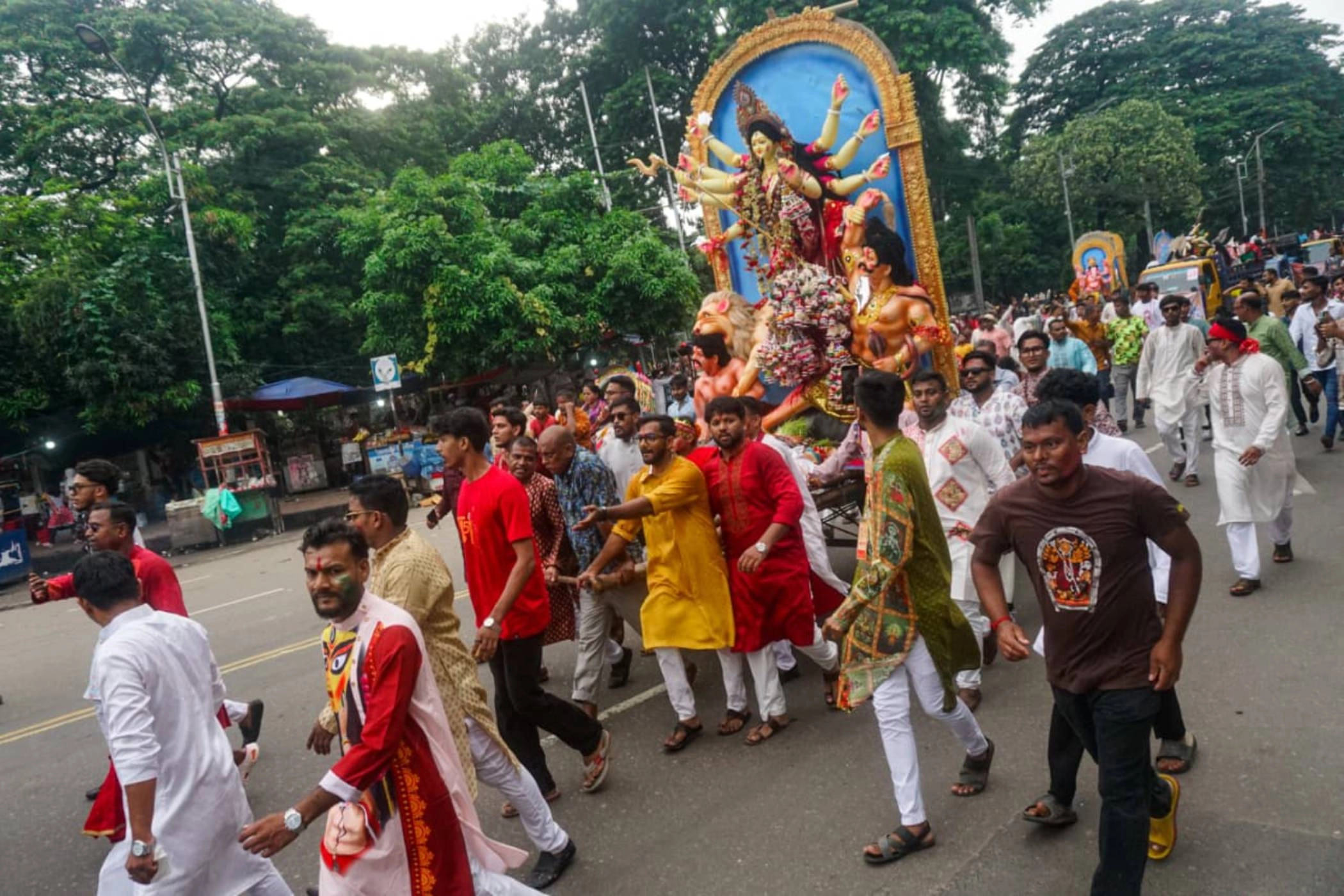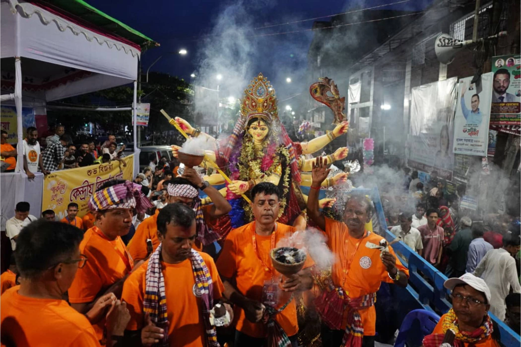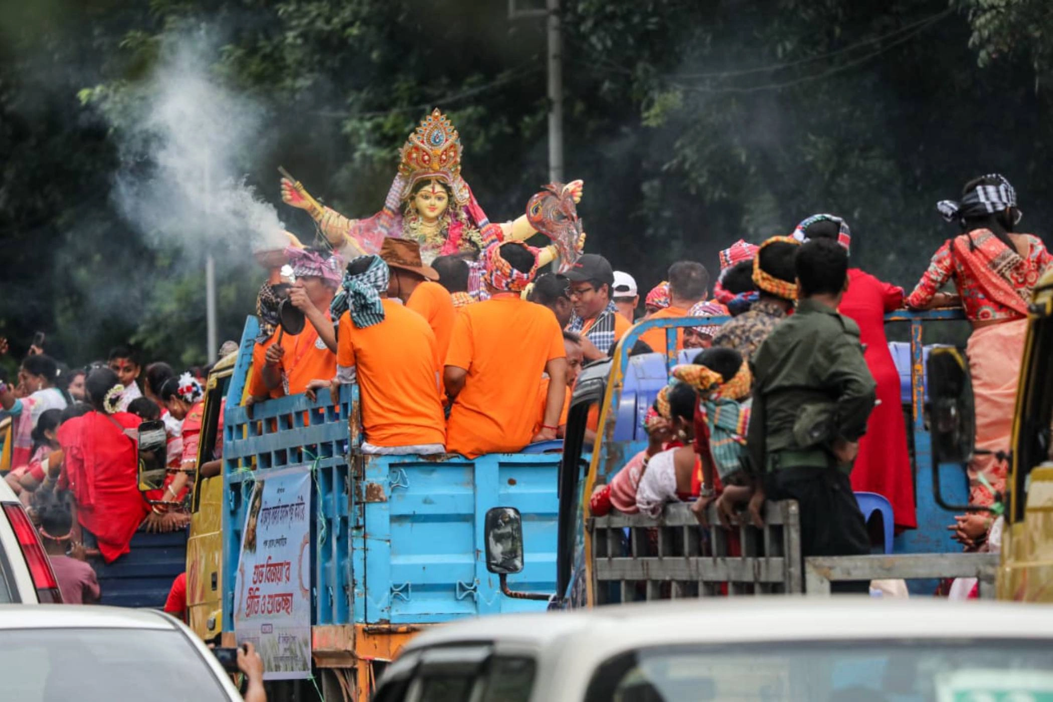 Devotees immerse the idols of Goddess Durga and her children in the Buriganga River at Sadarghat, Dhaka, marking the end of Sharadiya Durga Puja — the biggest festival of the Bengali Hindu community— on Thursday, October 2, 2025.