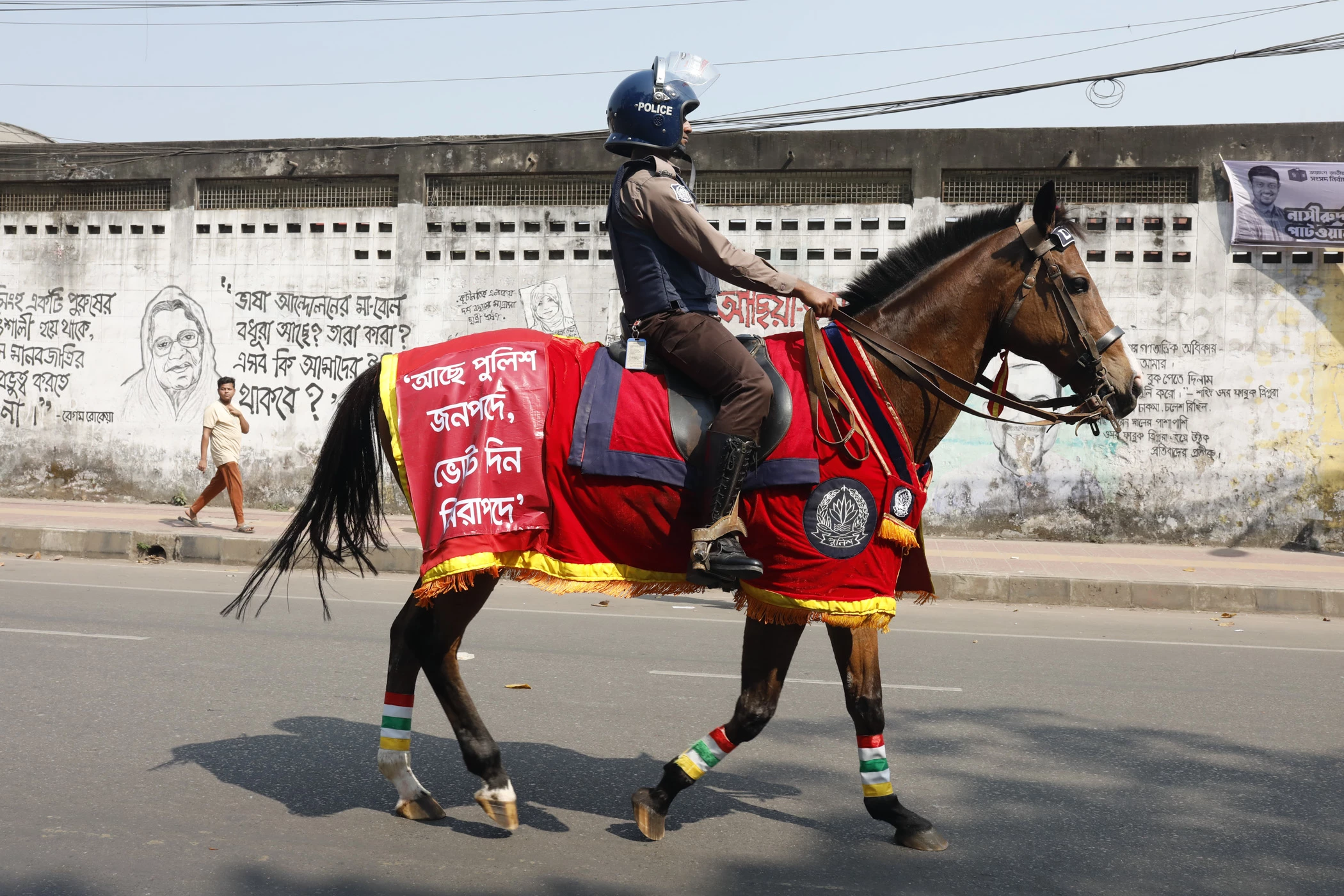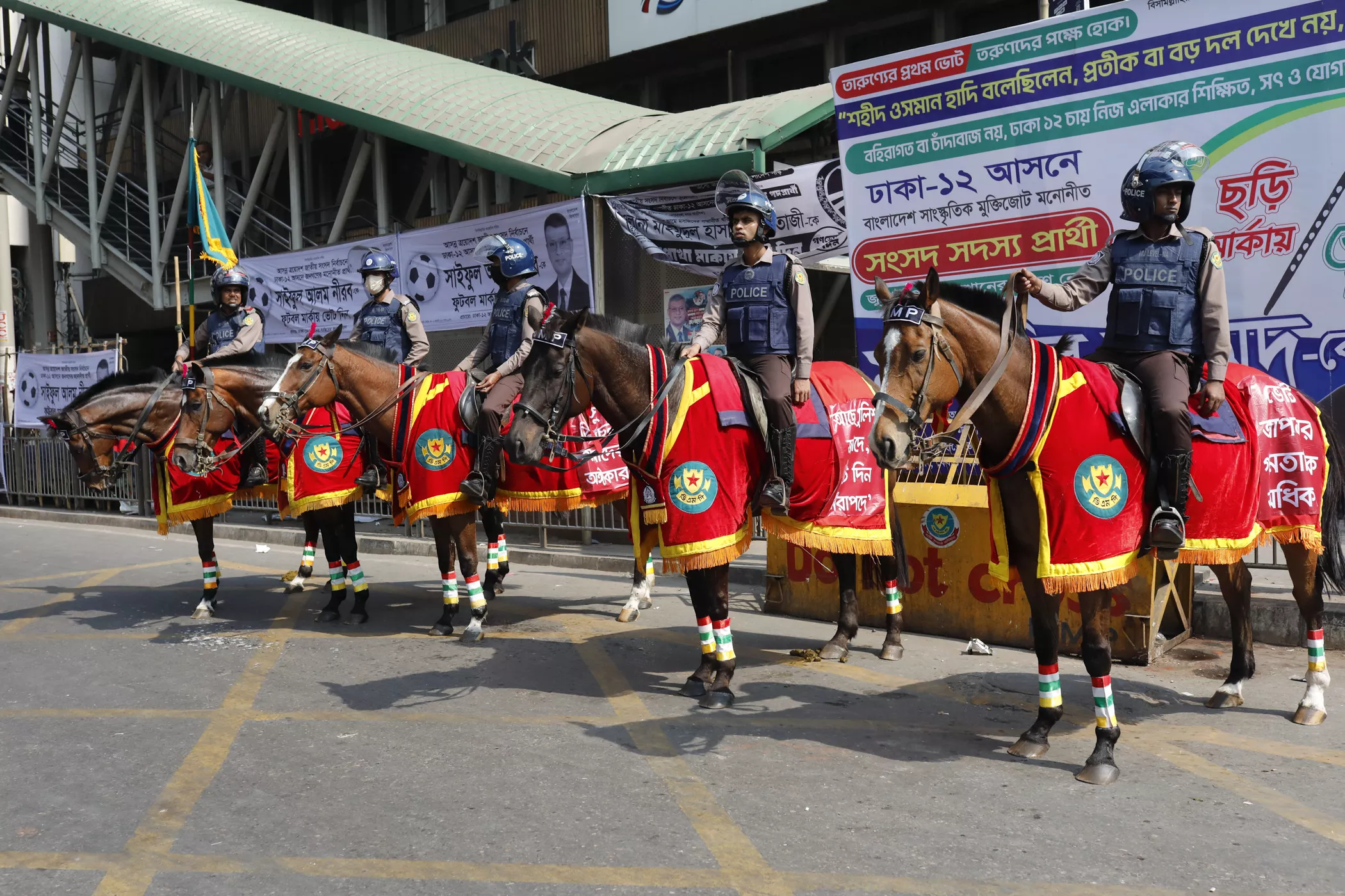 Members of the mounted police unit patrol different areas of Dhaka to enhance public awareness and strengthen security measures on the day of the national election.
